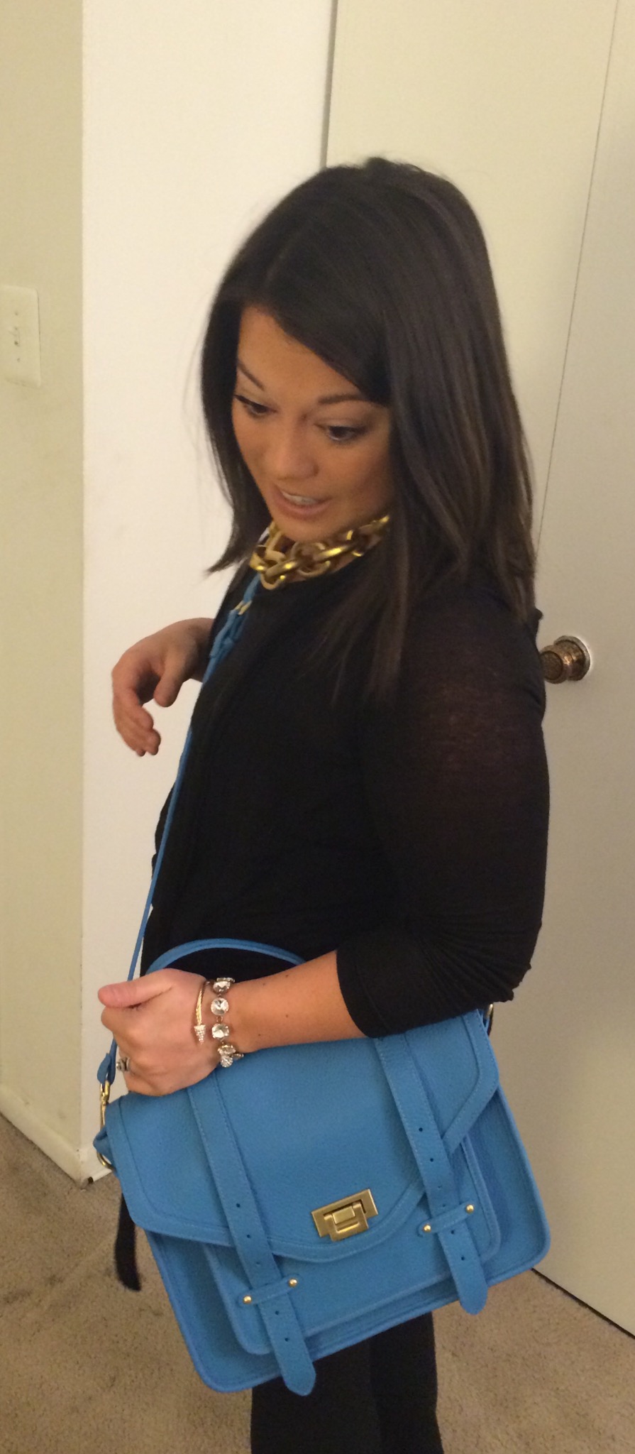 For my relaxed day at work, I decided to spice up an all black outfit with this ultra fabulous, ultra blue satchel.
