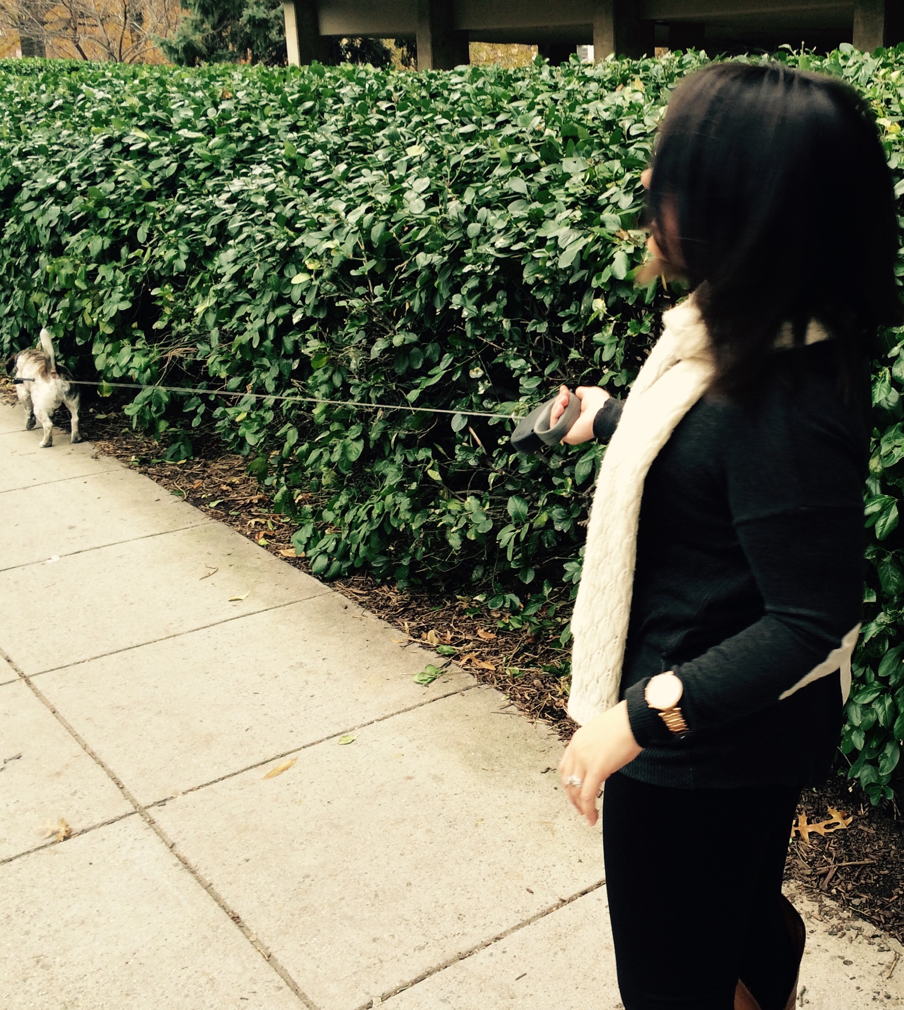I wore it with leggings (always) and a plain shirt. I topped it off with a chunky scarf and boots. It was the perfect look for running errands–allegedly casual, but actually thought through.